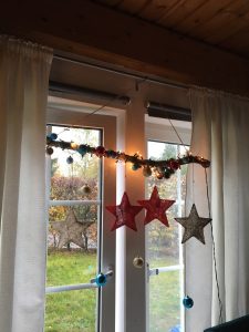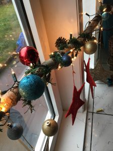 Ich habe den Ast an den Türgriff der Terassentür gehängt und mit goldenen Basteldraht die Sterne und Kugeln am Ast befestigt. Die Farben habe ich bereits passend zum diesjährigen Weihnachtsbaum gewählt – türkis – rot – gold