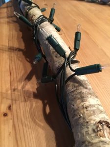 Schritt 1: Birkenast mit Lichterkette unwickeln. Darauf achten, das dass Ende auf der Seite ist, wo auch die Steckdose ist. Alternativ gehen auch Lichterketten mit Batterien oder Funk.