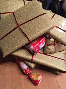 Beim aufhängen unbdingt darauf achten, dass die Glühbirnen der Lichterketten frei bleiben und nicht mit dem Geschenkpapier in Berührung kommen. Diese werden sehr heiß. Bei den Murmeln habe ich mich dazu entschieden, nur eine Murmel zu verpacken und aufzuhängen. Wenn er die aufmacht, bekommt er die Anderen natürlich auch. Das Gewicht war mir aber zu riskant, immerhin wackeln hier auch noch zwei Einjährige rum. Leider hat das goldene Papier nicht gereicht, ich habe dann normales Weihnachtspapier dazu genommen