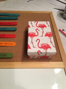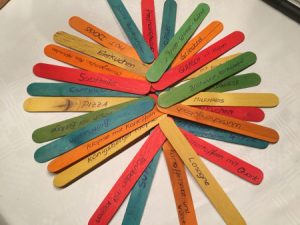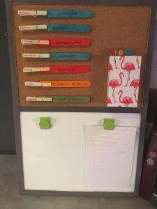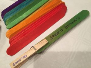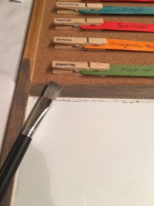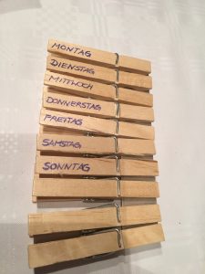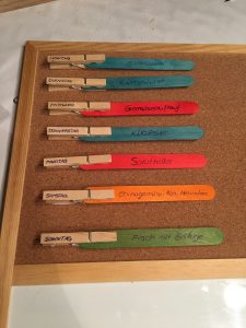 Als Erstes habe ich die Wäscheklammern und die Eisstiele mit unseren Lieblingsgerichten beschriftet. Dazu hatte ich den schwarzen Stift gekauft, mit Kugelschreiber hält es aber besser und verwischt nicht. Ich habe den Eisstiel vorher in der Klammer befestigt, so dass das Gericht auch angeklemmt lesbar ist. Danach werden die Klammern mit Holzleim auf die Pinnwand geklebt.