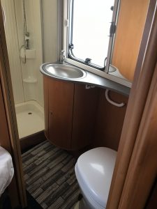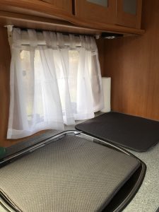 Eine neue Matratze und ebenfalls die Gardinen wie in der Mittelsitzgruppe, bringen ein gemütliches und stimmiges Bild. Mit dem übrig gebliebenen Stoff habe ich Kissen genäht. Dazu habe ich den Stoff zugeschnitten, die eine Seite zu genäht und die andere Seite mit selbstklebenden Klettband verschlossen. Somit sind die Kissen auch waschbar. Den Bodenteppich haben wir auch bewusst in das Bad hinein gelegt, da wir nicht im Wohnwagen duschen und somit es keine wirkliche Nasszelle bei uns ist. Da die Kinder für kleine Geschäfte die Toilette nutzen und auch der Hund Wasser benötigt, liegt dort aber noch eine Schutzmatte auf dem Teppich.