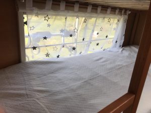 Wir haben also den Teppichboden gekauft und verlegt. Da die Kinderbetten direkt an der Tür sind und wir nicht möchten, dass die Kinder morgens einfach raus gehen, haben wir die Tür mit einem Türalarm gesichert. Sobald die Tür geöffnet wird, ertönt ein sehr lauter Ton. Das ist natürlich auch für mögliche Einbrecher eine gute Absicherung. Unter dem Hochbett haben wir eine LED Lichterkette gelegt, die mit einem Bewegungsmelder ausgestattet ist. Sollte eines der Kinder nachts dringend auf die Toilette müssen, geht bei Bewegung das Licht an und sie können sich gut orientieren. Die Hochbetten haben wir dann noch mit Wimpelketten und Kissen gemütlich gemacht sowie eine Scheibengardine mit Sternen, in der Mitte angebracht. Die rote kleine Leiter ist eigentlich Teil eines Kinderbettes gewesen. Für den junior ist es so aber einfacher in sein Bett zu kommen, denn ansonsten muss er immer durch das Loch in der Treppe steigen. Derzeit fehlt noch ein Rausfallschutz in der Mitte. Dieser folgt in den kommenden Tagen.